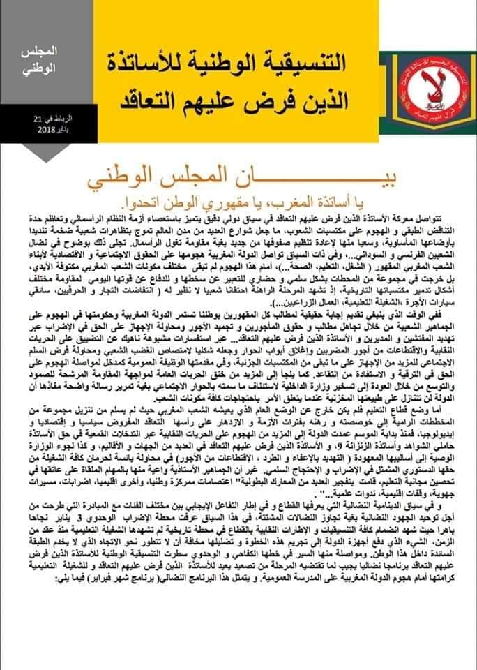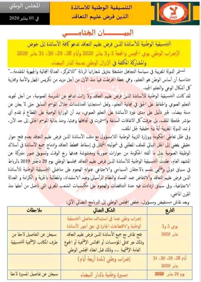 تحميل بيان التنسيقية الوطنية للأساتذة الذين فرض عليهم التعاقد والنقابات لإضراب 28 29 30 31 يناير